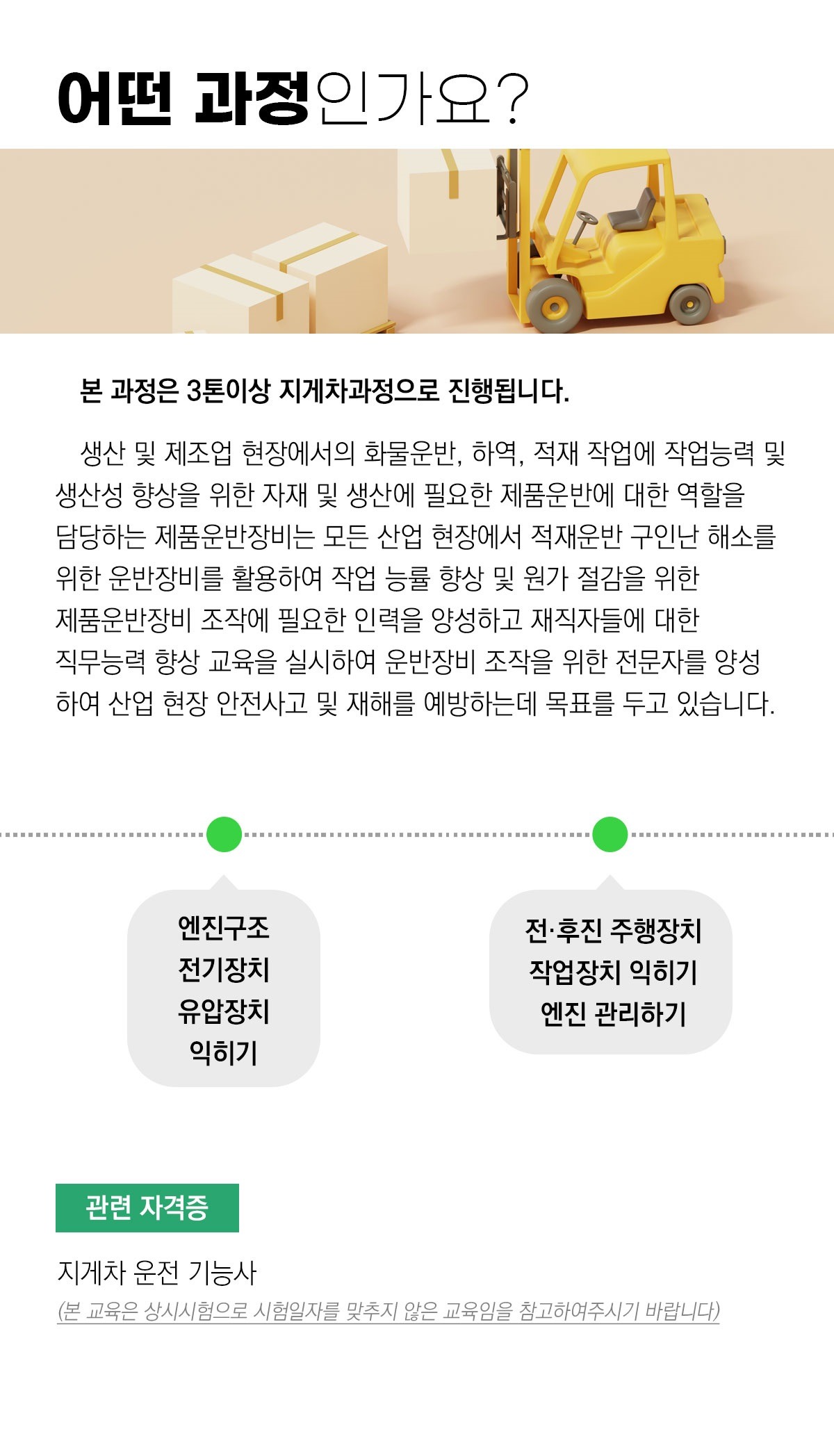 | 지게차운전기능사 | 2025년 3월, 6월, 9월, 11월 | 필기: 안전관리, 하역 장치 구조 / 실기: 주행 및 적재 능력 | 기출문제 반복 + 운전 영상 참고 + 실습 참여 |